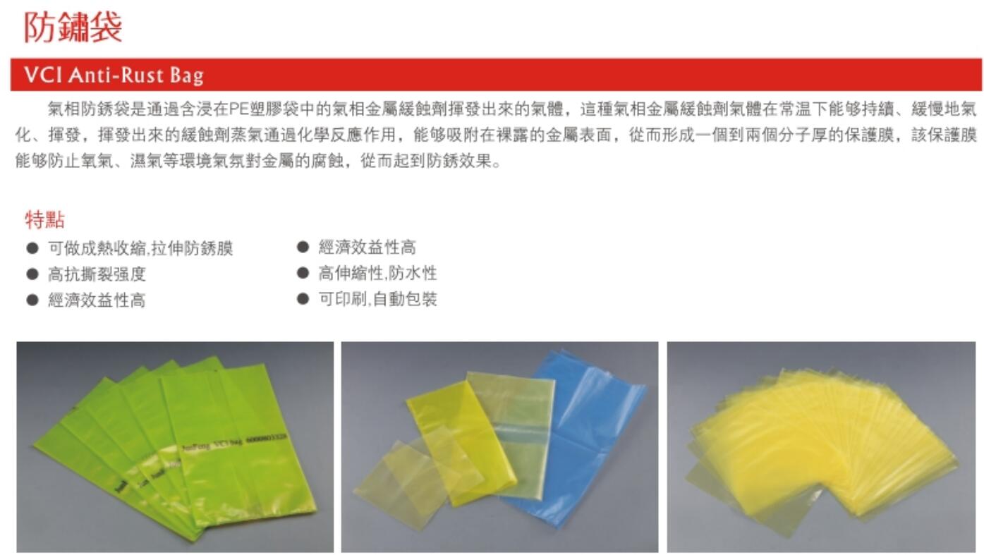 描 述: 气相防锈PE袋是通过含浸在PE塑料袋中的气相金属缓蚀剂挥发出来的气体,这种气相金属缓蚀剂气体在常温下能够持续、缓慢地气化、挥发,挥发出来的缓蚀剂蒸气通过化学反应作用,能够吸附在裸露的金属表面,从而形成一个到两个分子厚的保护膜,该保护膜能够防止氧气、湿气等环境气氛对金属的腐蚀,从而起到防锈效果。